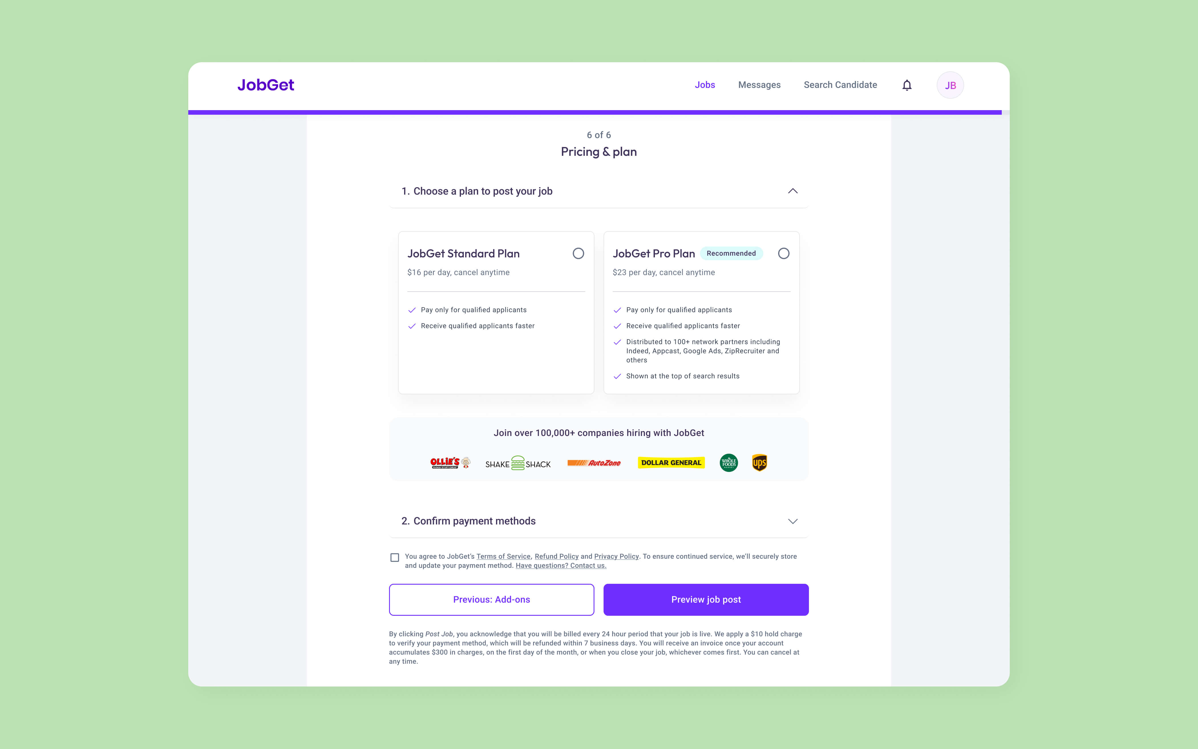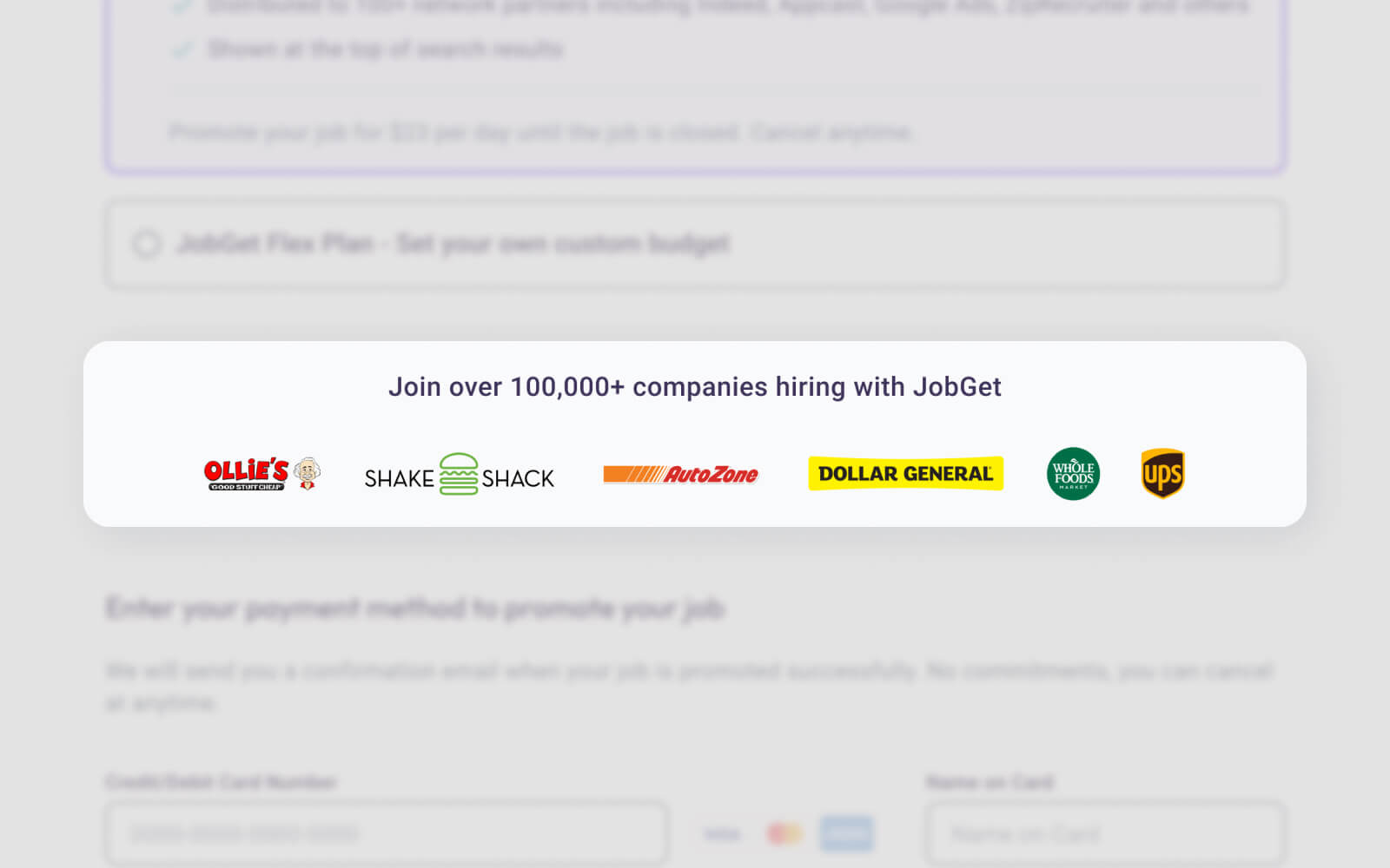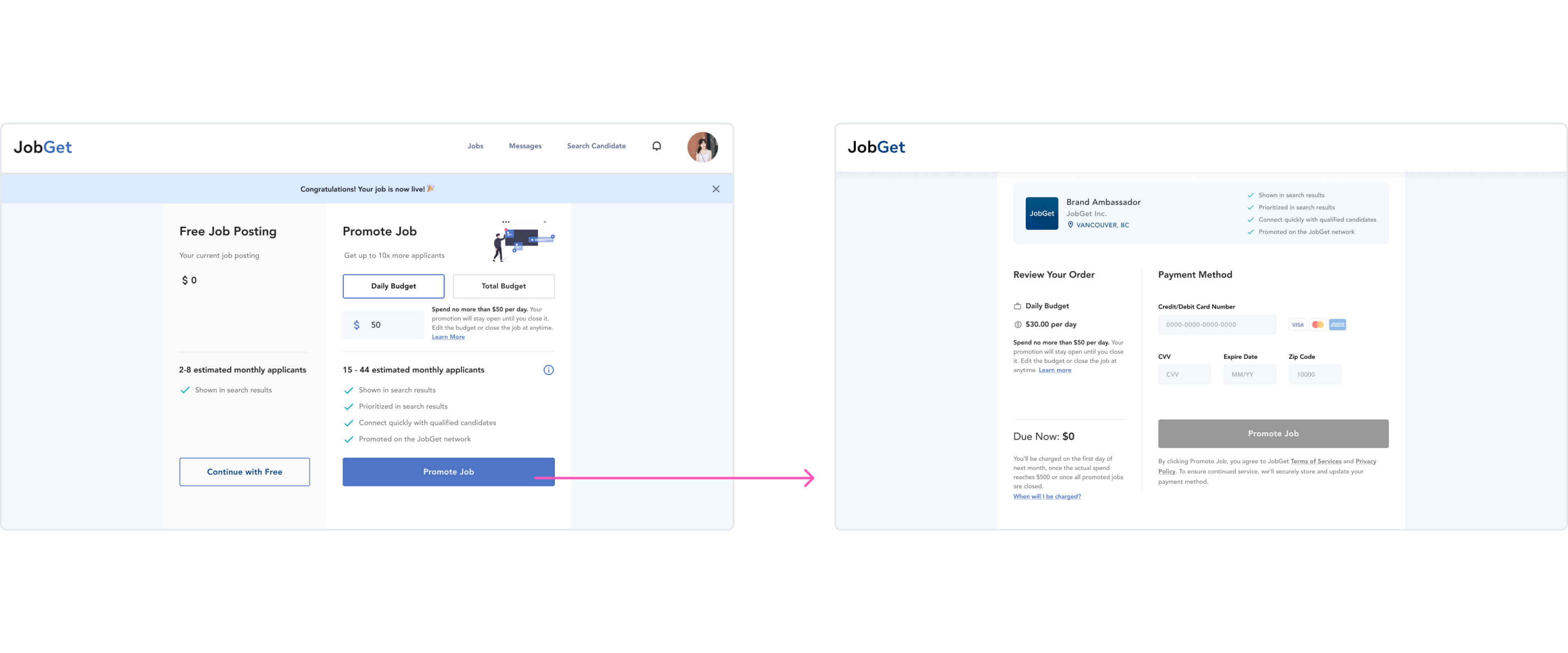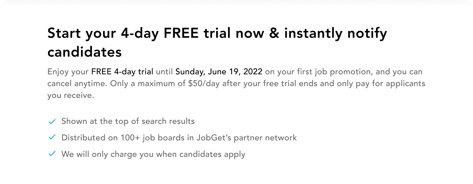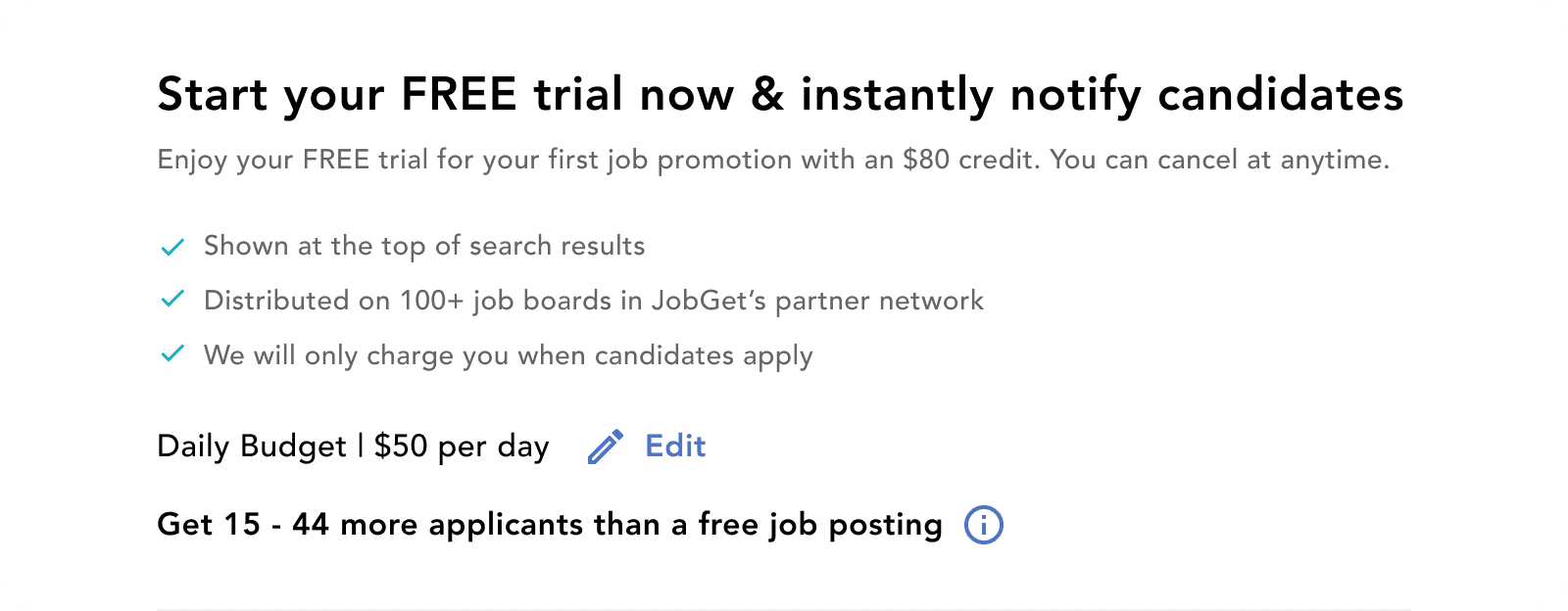 JobGet initially chose a pay-for-performance model over a subscription model due to its higher revenue scaling potential. After employers posted a job, they would see an option to set a budget and promote their listing. Employers can choose from one of the following plans: