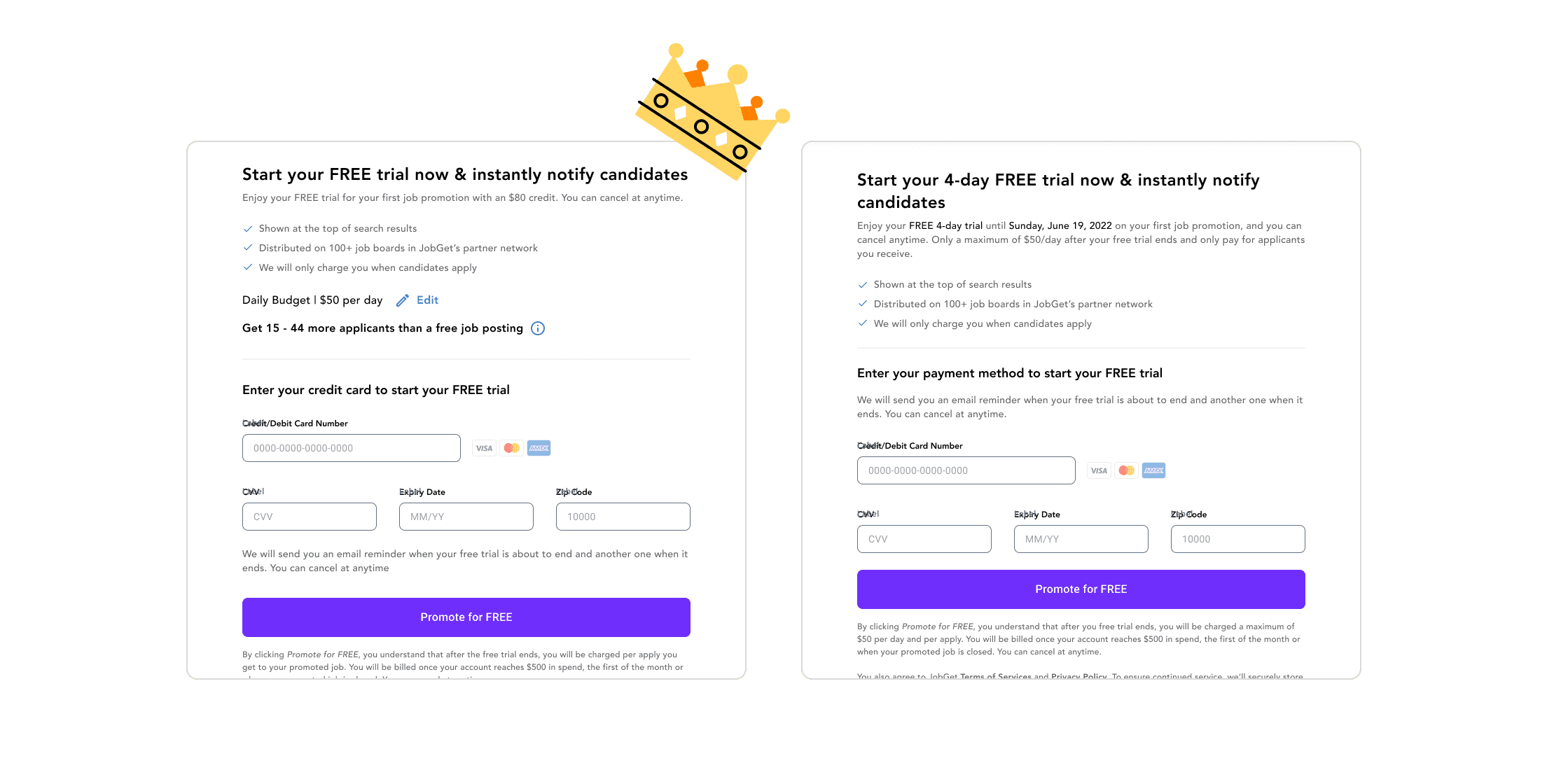 In Q2 2022, JobGet added the ability for free trial. After implementing freemium, our conversion rate for (employers who posted a job to employers who promoted a job) grew from ~1% to ~7%.