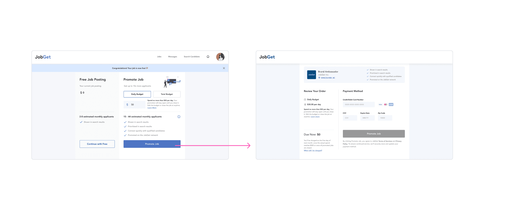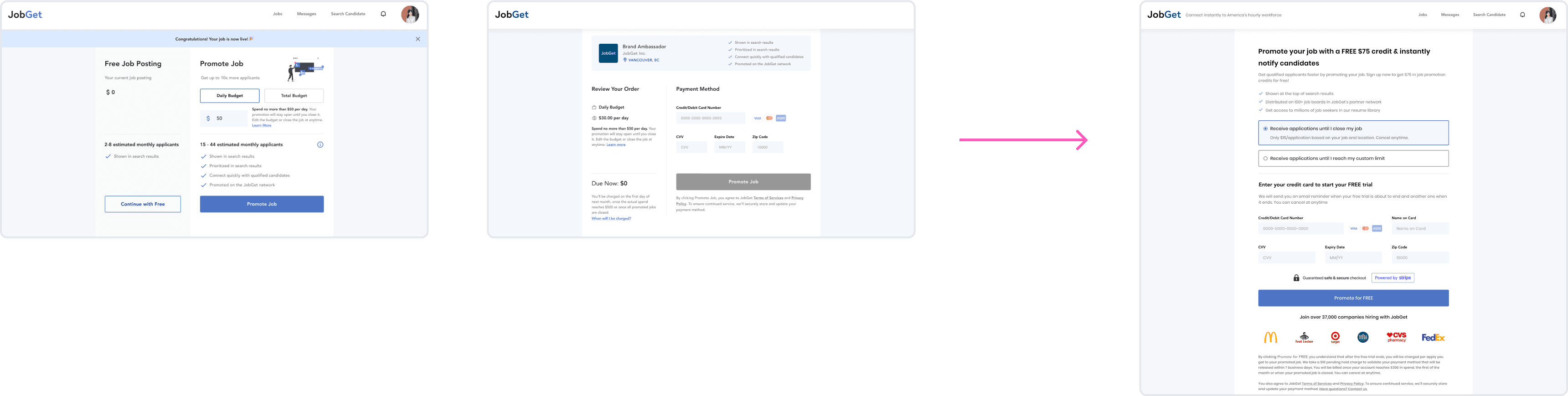 JobGet initially chose a pay-for-performance model over a subscription model due to its higher revenue scaling potential. After employers posted a job, they would see an option to set a budget and promote their listing.